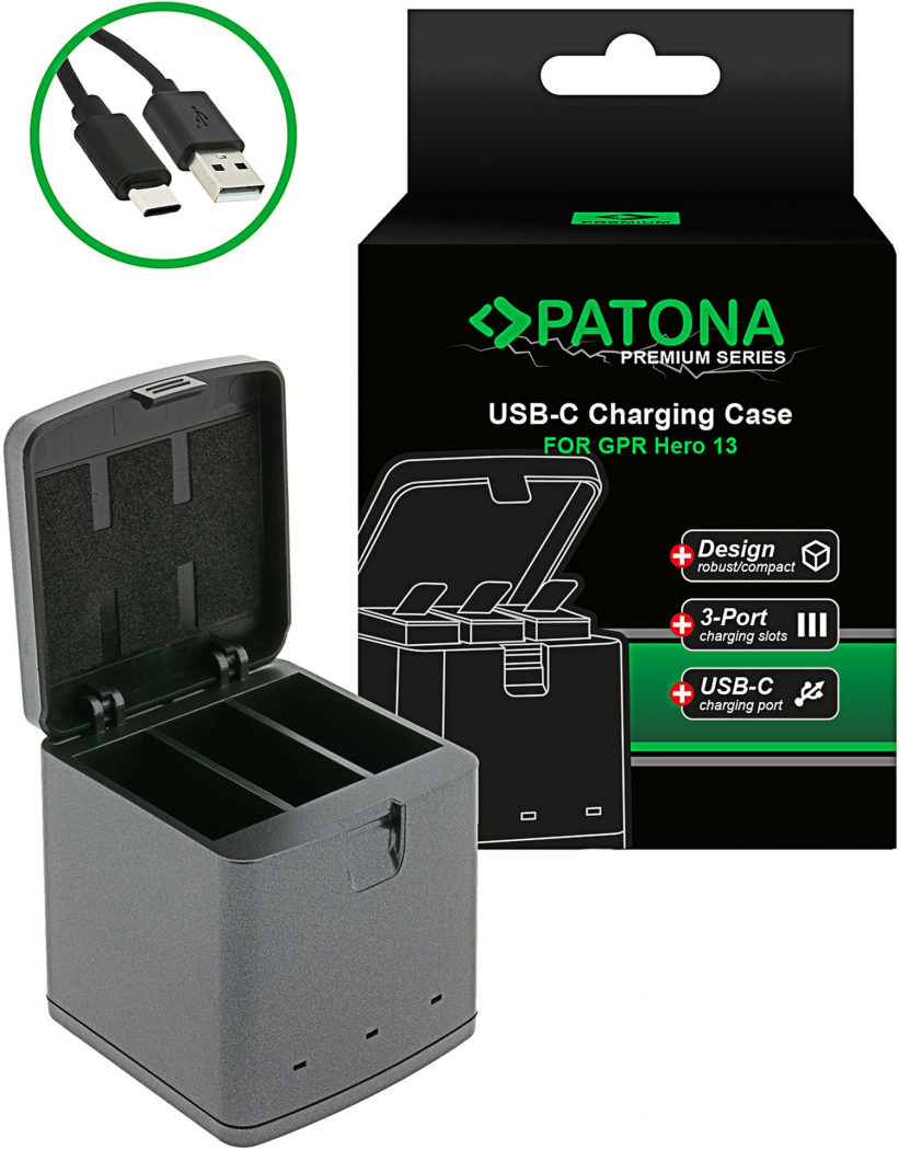 PATONA Premium Tripple-Charger Ladebox für GoPro Hero 13 + USB-C Kabel
